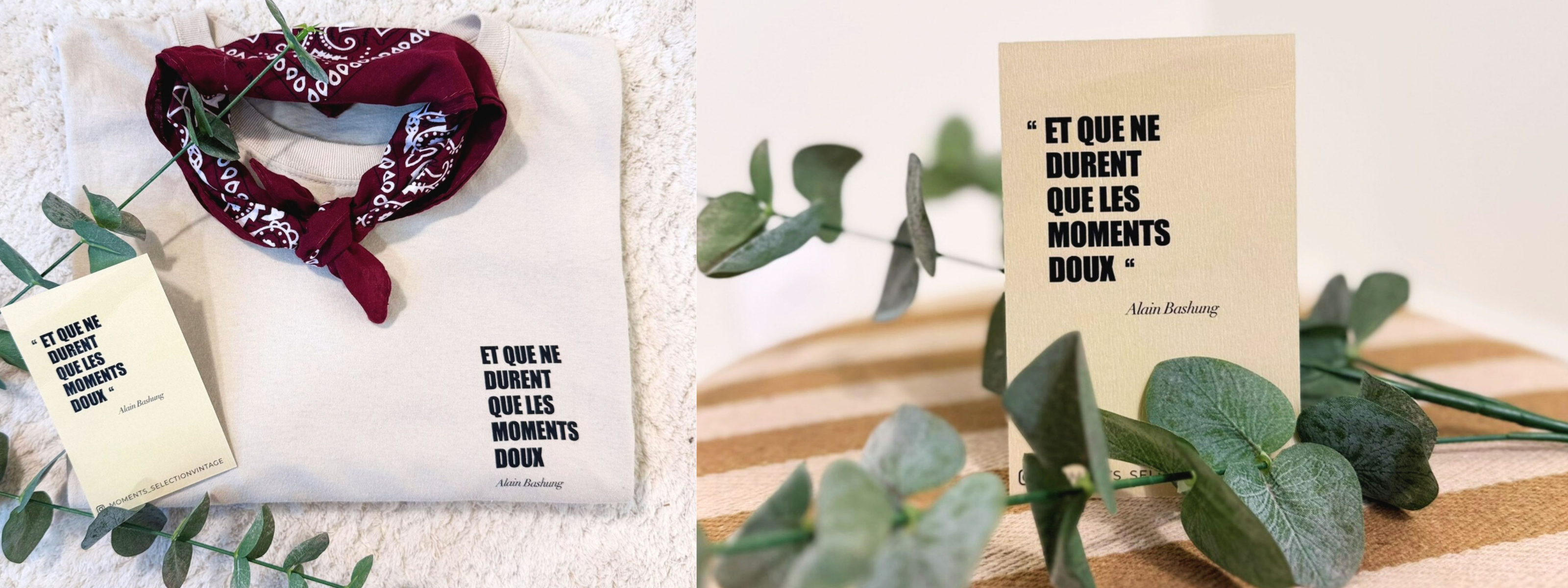 T-shirt et bandana vintage recyclés avec avec une impression d’une phrase culte d’Alain Bashung de la chanson "Osez Joséphine": « Et que ne durent que les moments doux ».